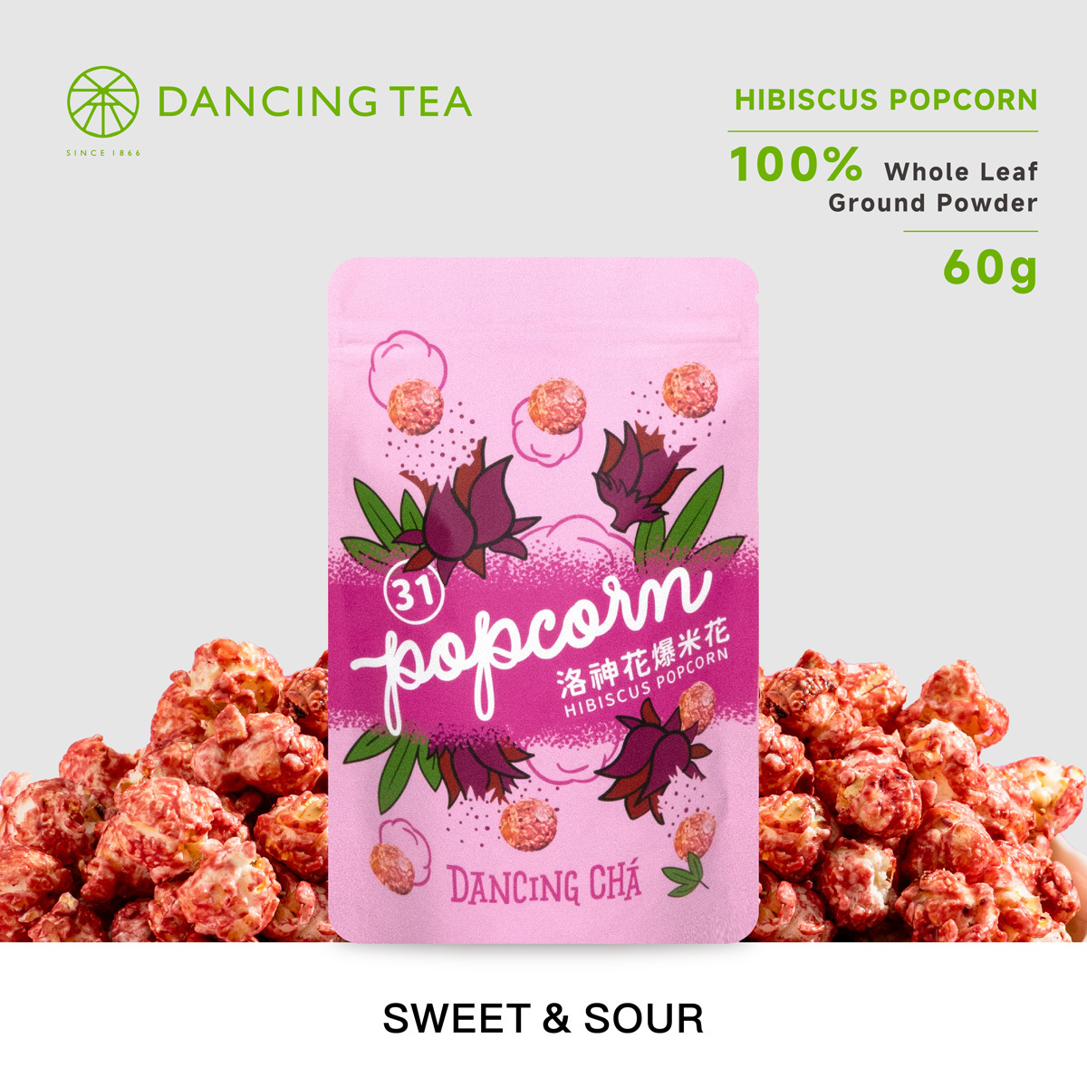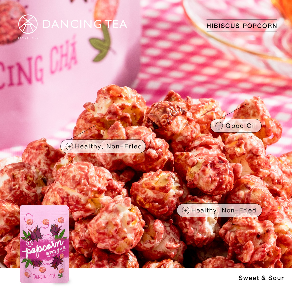 DANCING TEA’s Hibiscus Popcorn uses carefully selected hibiscus flowers, ground into fine powder and blended with mushroom-shaped popcorn to create a perfectly balanced sweet-and-sour flavor that redefines popcorn.