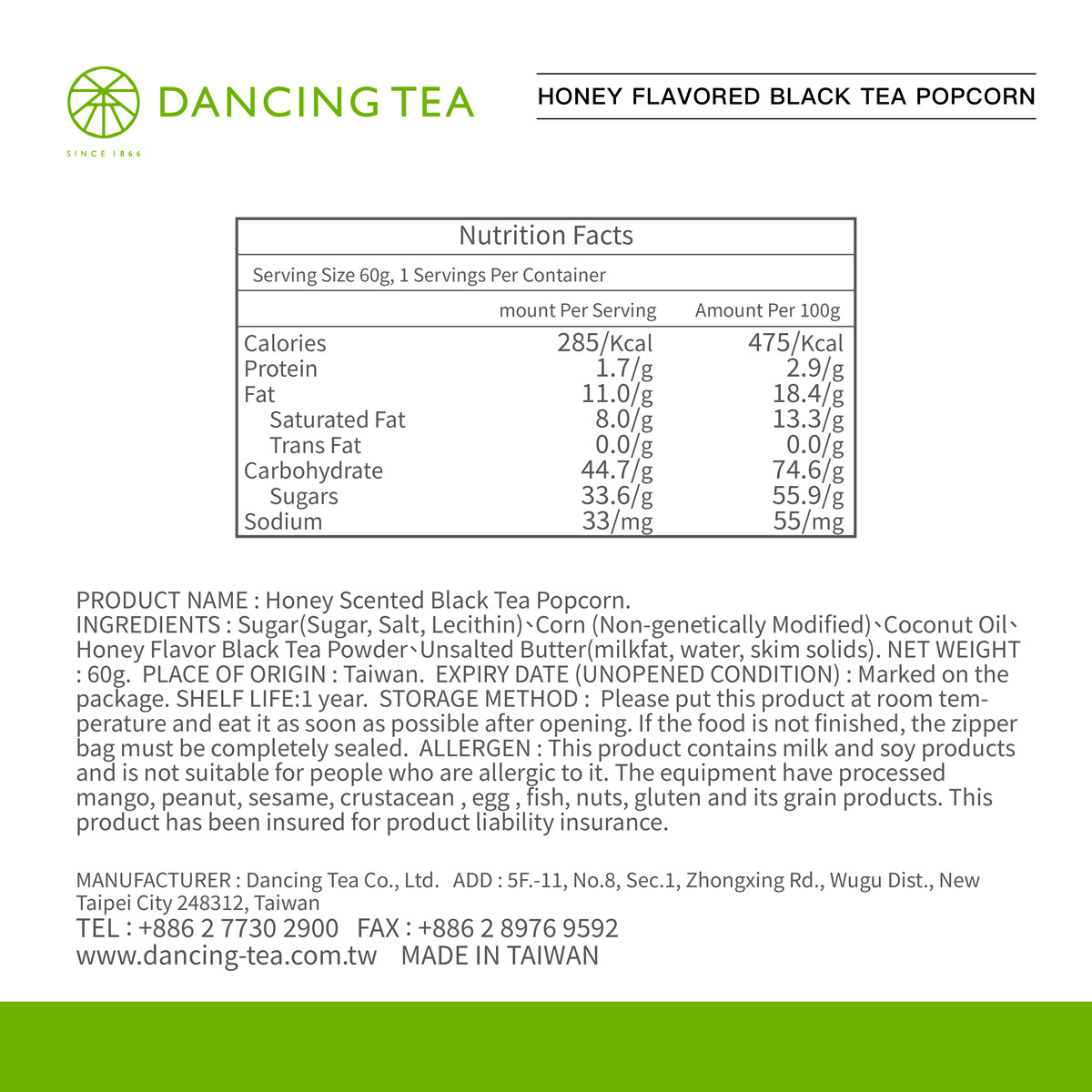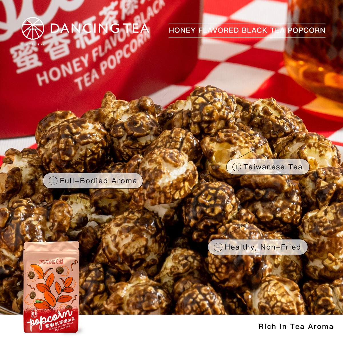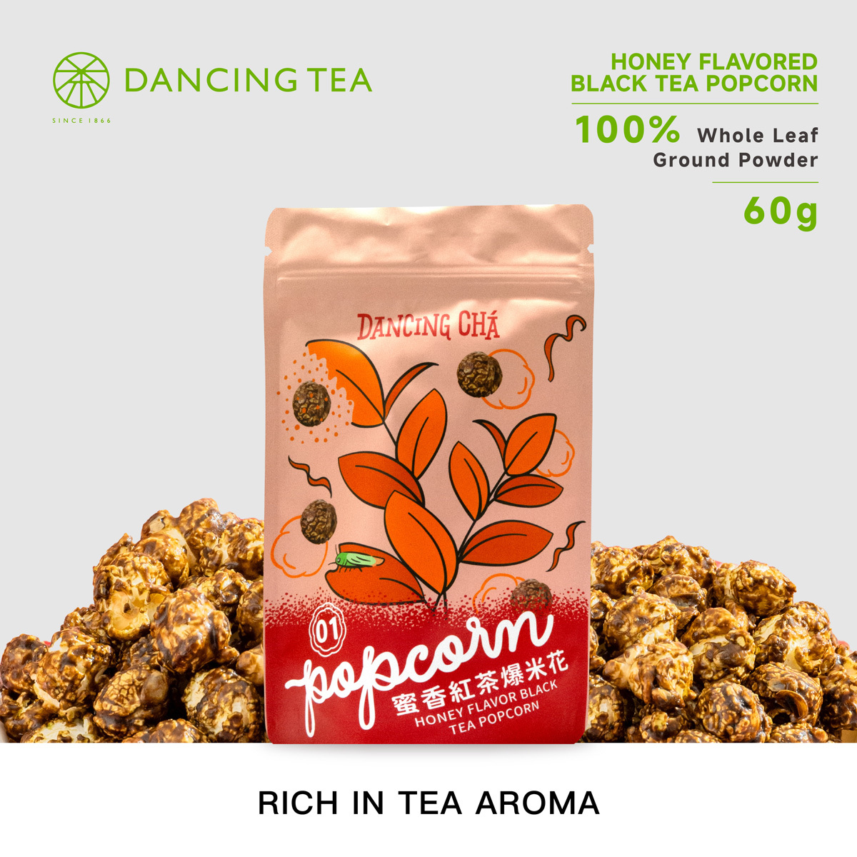 DANCING TEA’s Honey Flavor Black Tea Powder comes from small-leaf black tea bitten by green leafhoppers in pesticide-free Hualien, creating a natural honey aroma. Low-temperature ground, it adds a sweet, fruity black tea flavor to popcorn.