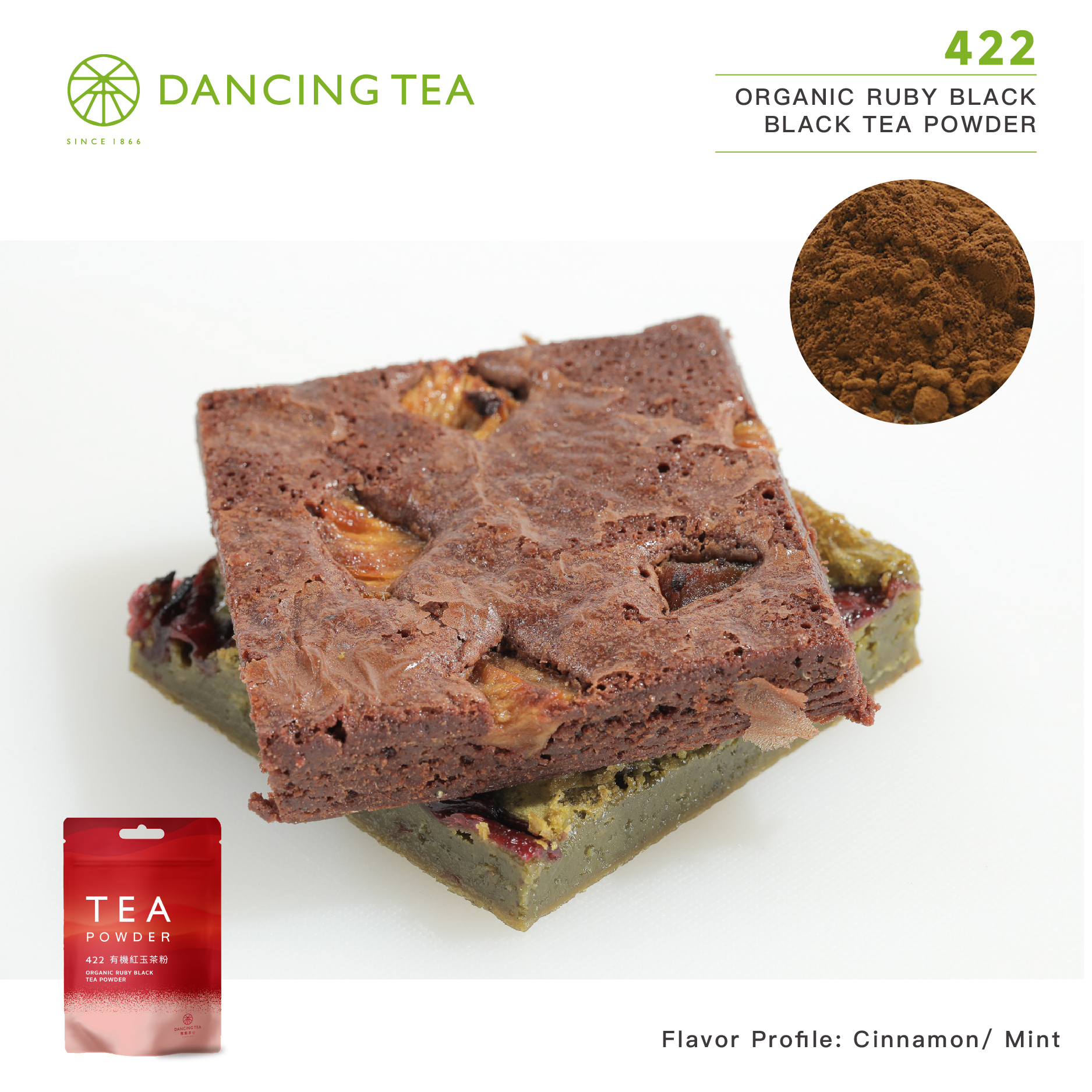 Organic Ruby Tea Powder, certified by Tse-Xin Organic, is a black tea cultivar developed in Taiwan from wild mountain and Burmese large-leaf tea, known as “Taidian No.18” or “Ruby.”