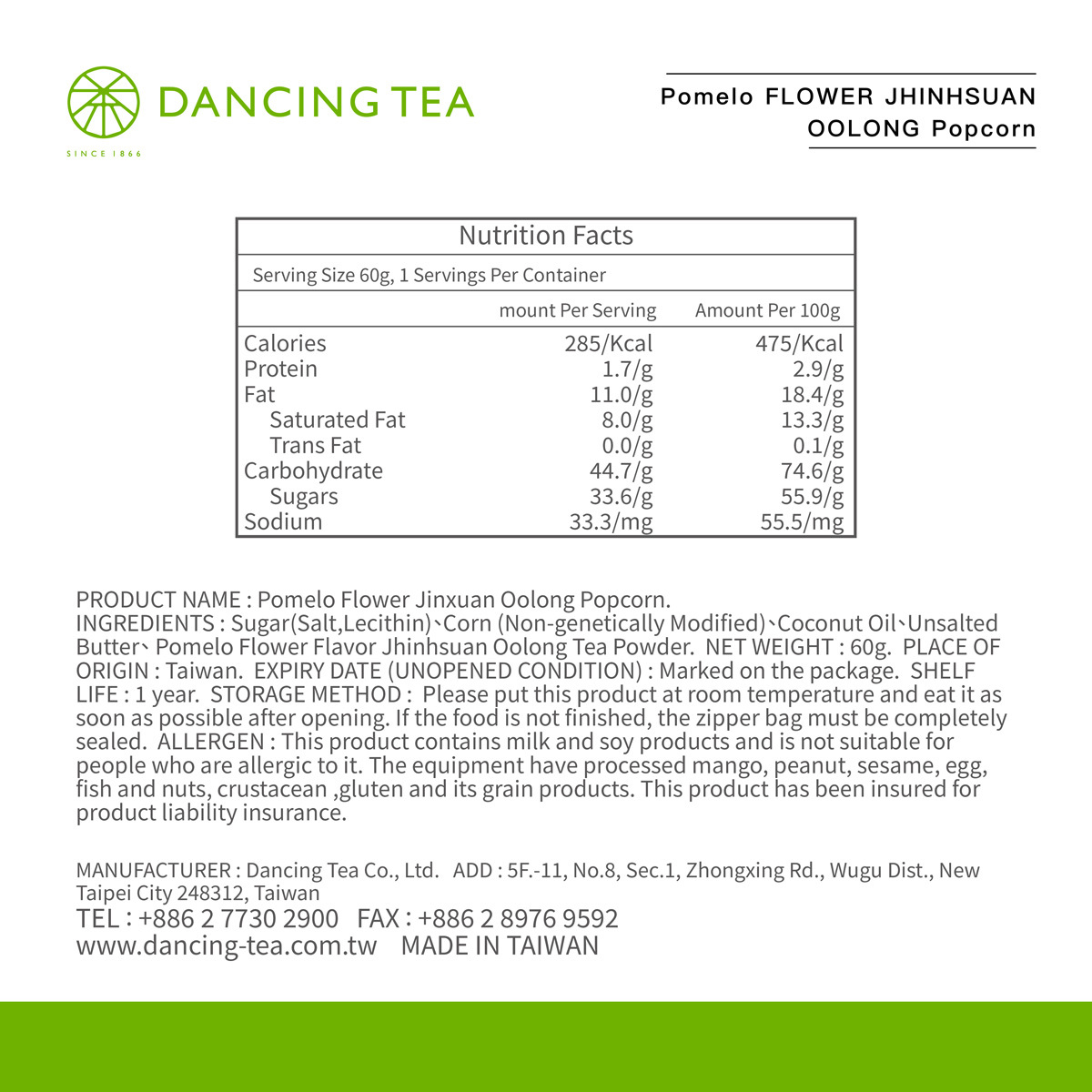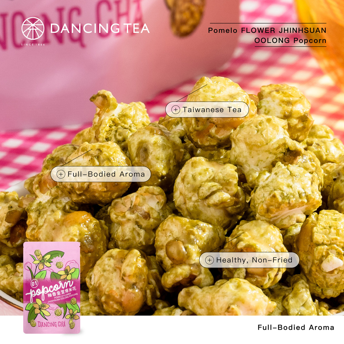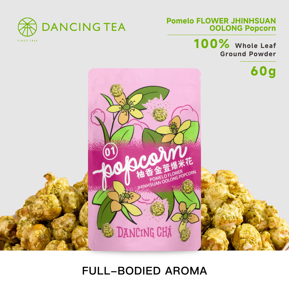 DANCING TEA’s Pomelo Flower Jhinhsuan Oolong Powder blends naturally farmed pomelo flowers with Jhinhsuan tea in a 1:1 ratio. Low-temperature ground, it captures the fresh floral aroma, making popcorn with a unique, delicate scent.