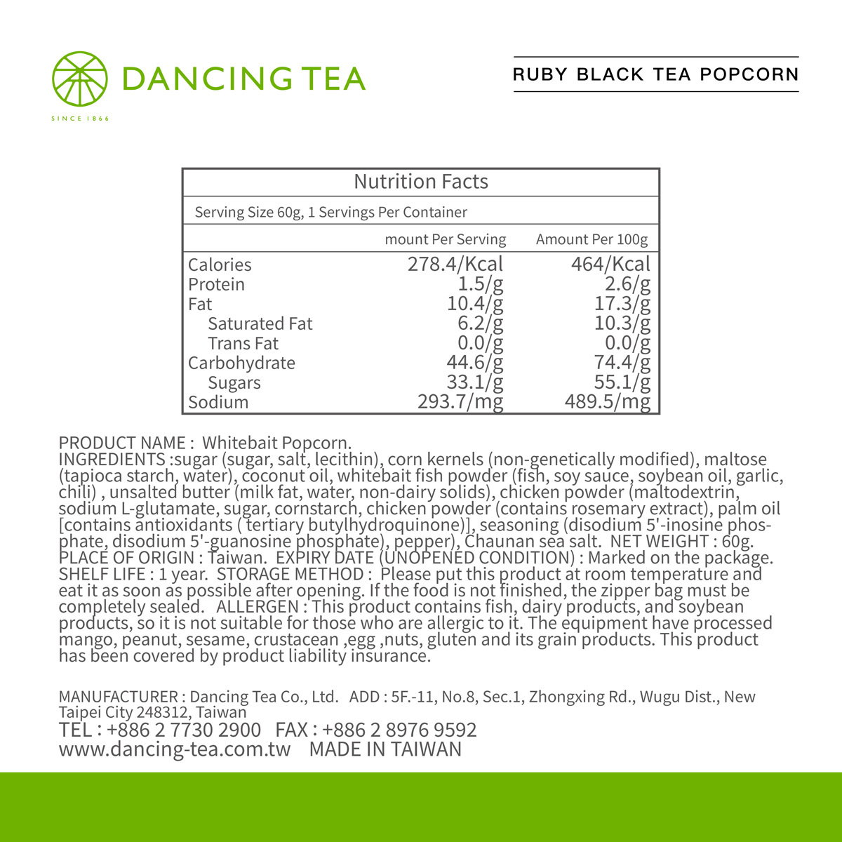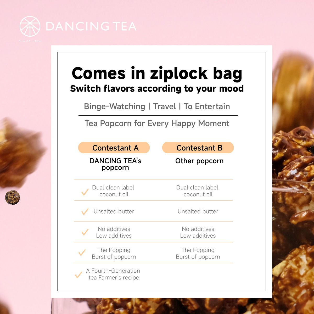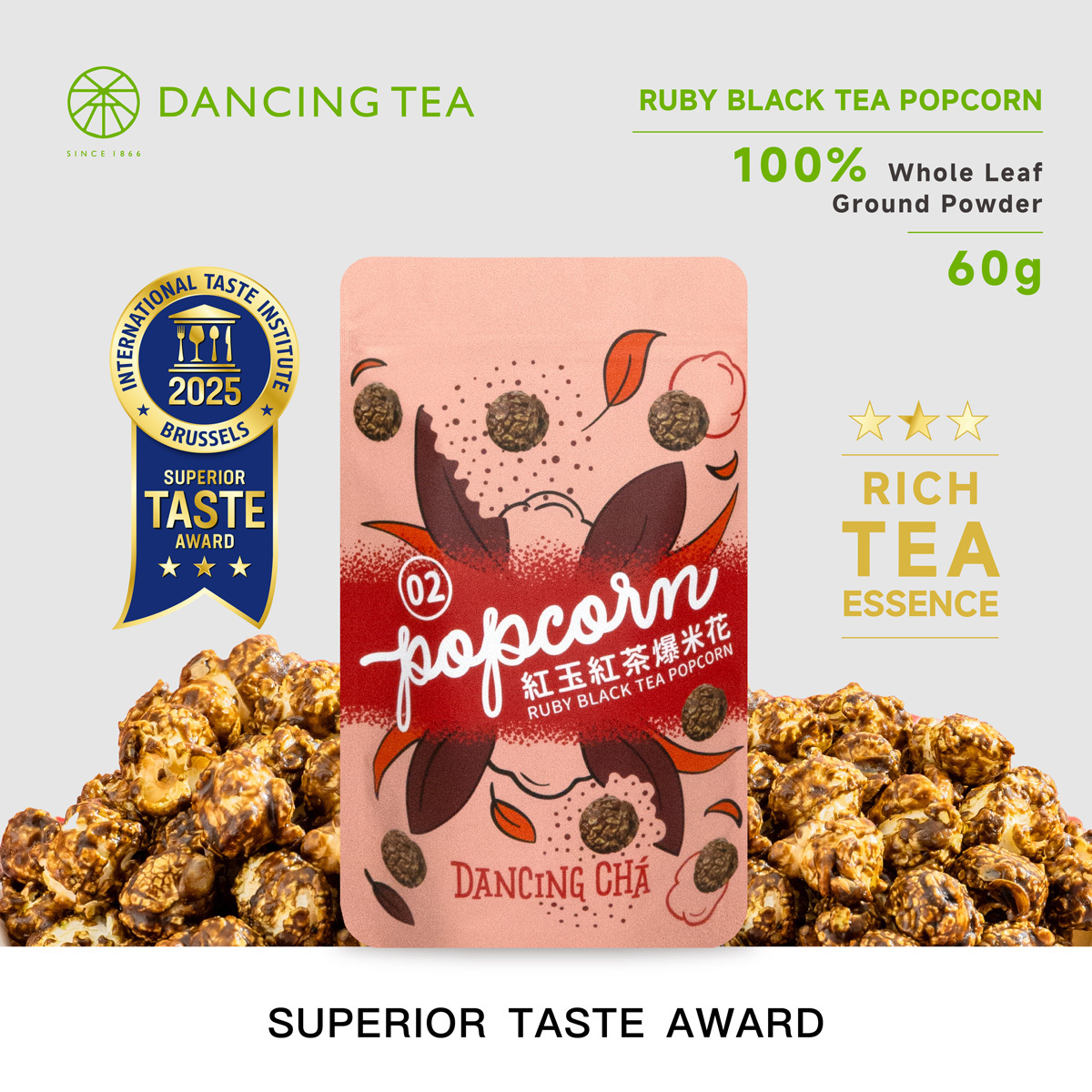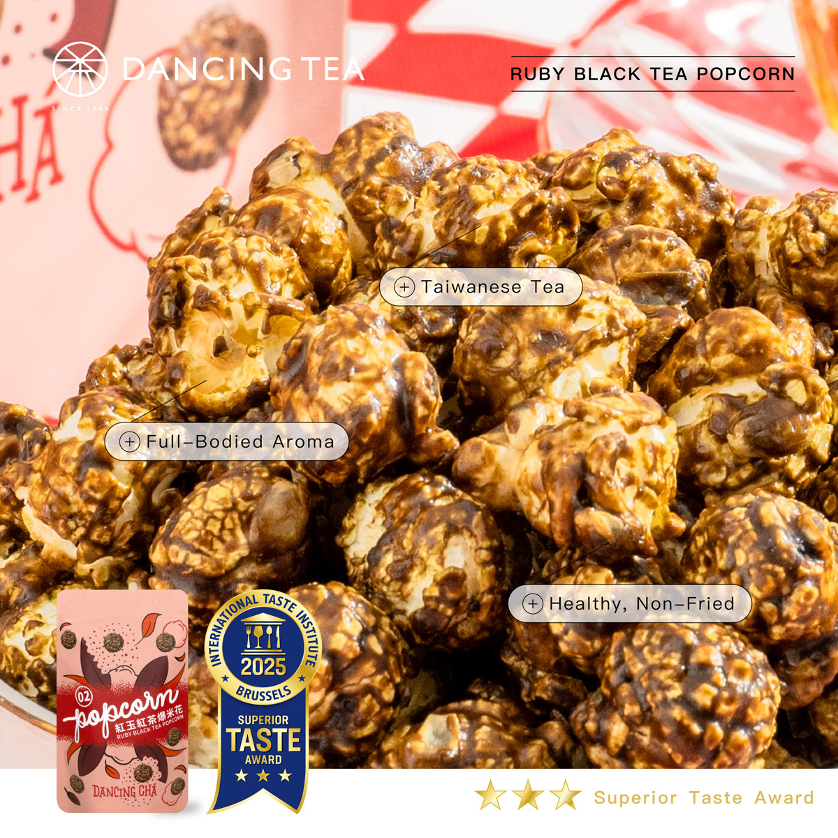 DANCING TEA’s Ruby Black Tea Powder comes from Taiwan Tea No.18 (“Ruby”), preserving its unique mint and cinnamon flavor. Perfectly crafted into popcorn, it delivers a delightful, surprising taste.